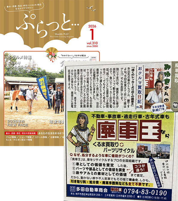 垂水・須磨・西区・明石の地域情報誌「ぷらっと」12月号で多田自動車が紹介!廃車買...